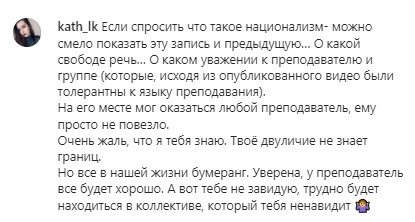 Цікаво, що конфлікт дійшов до адміністрації університету, і там його вирішили по-своєму — одразу ж звільнили викладача, який відмовився вести лекції українською мовою. Додаткових роз’яснень ніхто не давав, через що на україномовну студентку швидко накинулися одногрупники. За словами Маргарити, вона регулярно отримує загрози на свою адресу через те, що почала відстоювати українську мову.