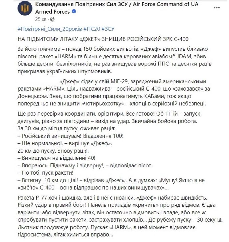 Пілот “Джеф”, нагороджений “Хрестом бойових заслуг” та орденом “За мужність ІІІ ступеня”, на підбитому МіГ-29 знищив російський зенітний ракетний комплекс С-400, який був розташований “за Донецьком”.
