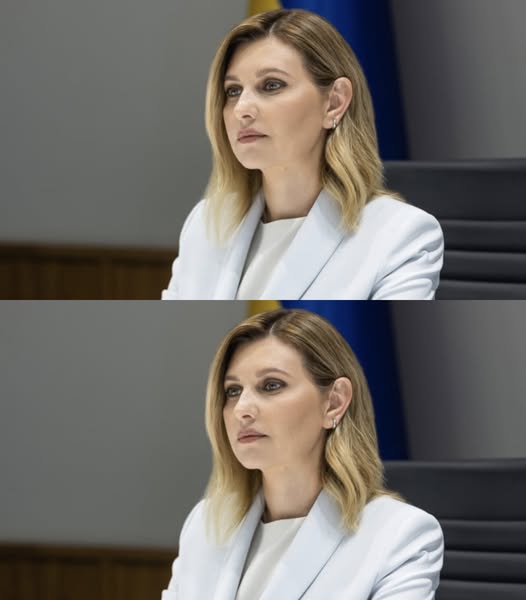 Під час онлайн-зустрічі Олена постала у блакитному жакеті і білій блузці. До лацкану жакета перша леді прикріпила свою улюблену символічну брошку у вигляді мапи України від українського бренду Gasanova.