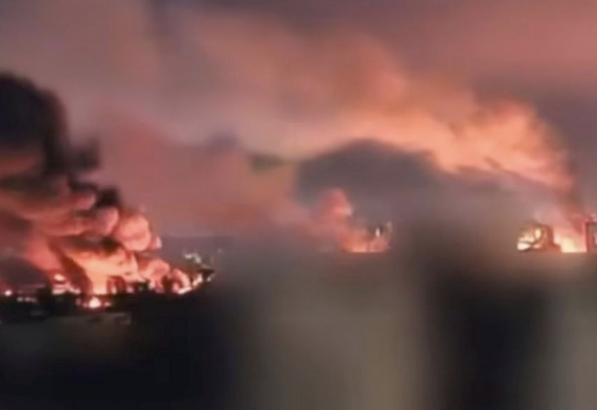 Внаслідок падіння уламків палають 9 автівок. Вогонь розповсюджується на перші поверхи нежитлової будівлі поруч.